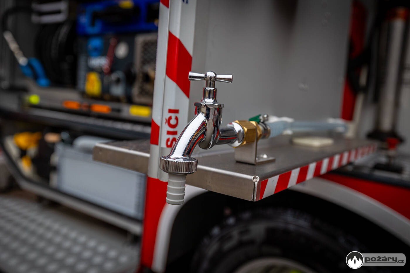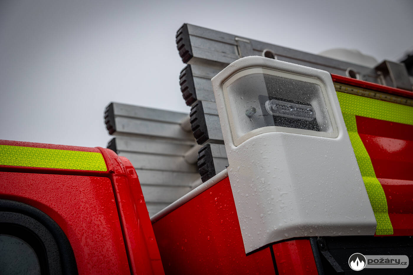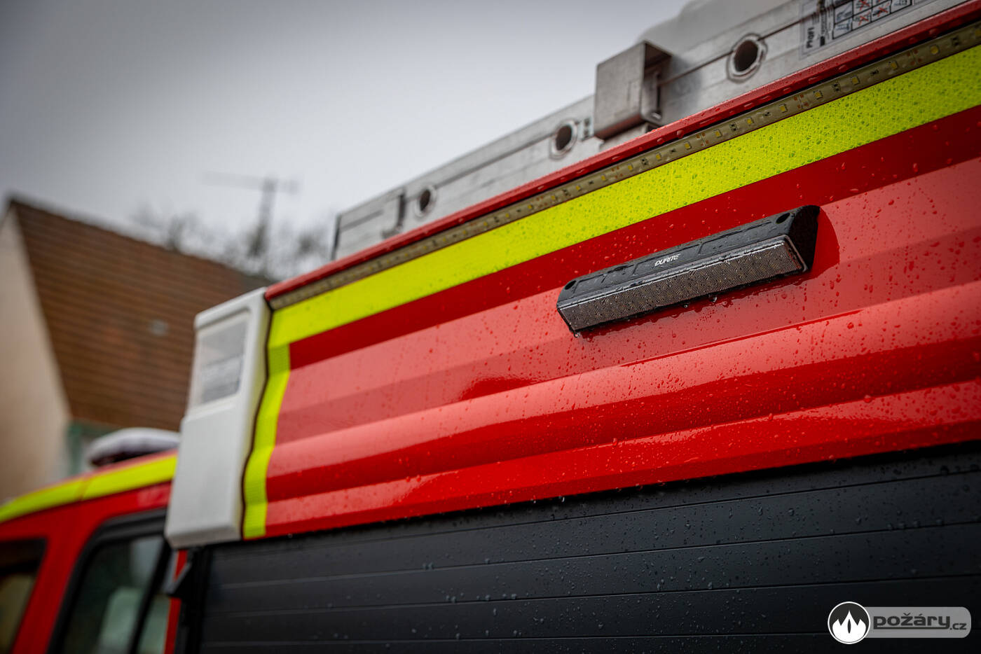 Na střeše vozidla je uloženo rozměrné požární příslušenství, včetně žebříku, savic, trhacího háku a hliníkového boxu pro další výbavu. Na víku boxu jsou uchycena transportní nosítka.