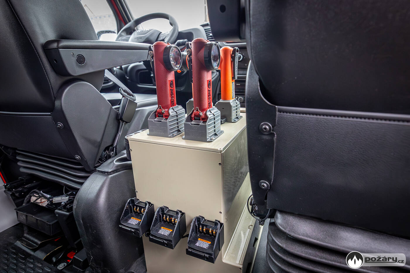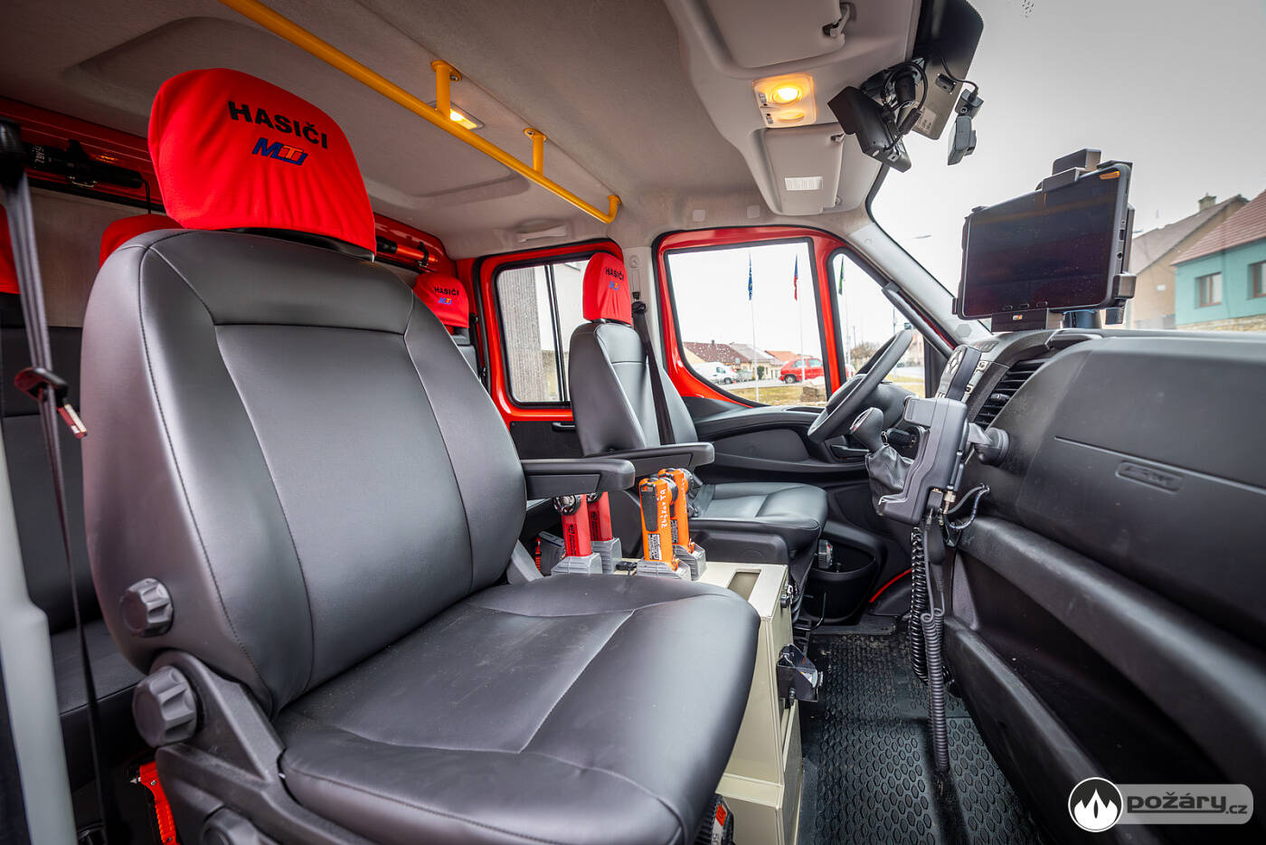 Kabina je, tak jako většina požárních vozů, šestimístná a vybavená analogovou vozidlovou radiostanicí a digitálním vozidlovým terminálem. Pod druhou řadou sedadel je úložný prostor přístupný shora, zatímco prostor nad ní obsahuje polici pro uložení reflexních vest a pracovních polohovacích pásů. Pro větší komfort posádky je kabina vybavena klimatizací a 2 kW nezávislým vytápěním. Nechybí ani čtyři dobíjecí úchyty pro ruční radiostanice a čtyři pro ruční svítilny. Velitel má k dispozici výjezdový tablet a prostor před vozidlem je monitorován kamerou.Nástavba